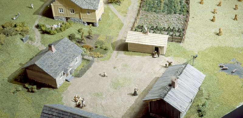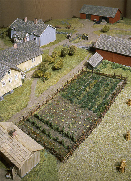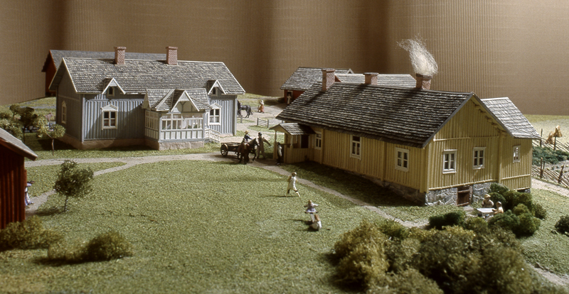 Elämää Glimsin kievarin pihapiirissä 1800-luvulla, vieraita saapuu kieseillään, herrasväki kahvittelee sireenimajassa ja toisaalla palvelusväki toimittaa omia arkisia askareitaan.