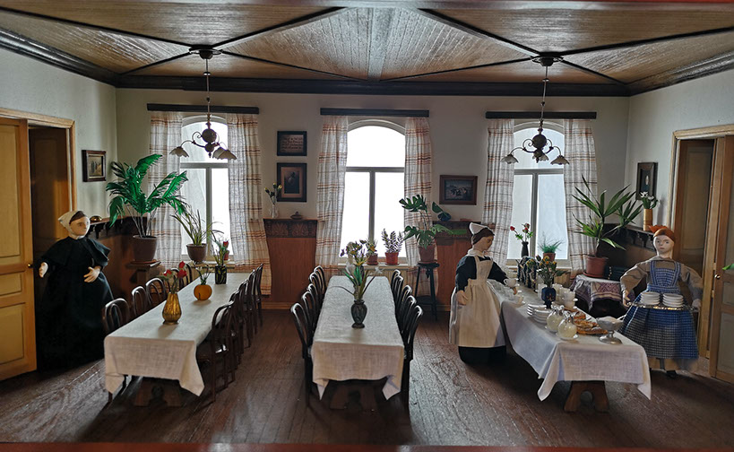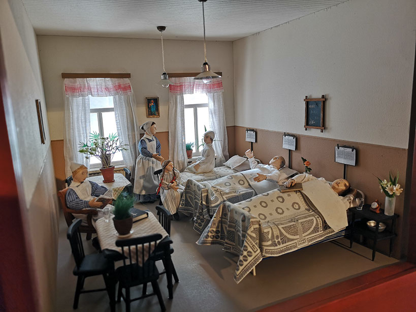 Viitteellisessä pienoismallirakennuksessa on avattu kolme huoneinteriööriä jotka kuvaavat 1800-1900 luvun vaihteen elämää Helsingin Diakonissalaitoksella : potilashuone, ruokasali ja vanhemman diakonissan asuinhuone.