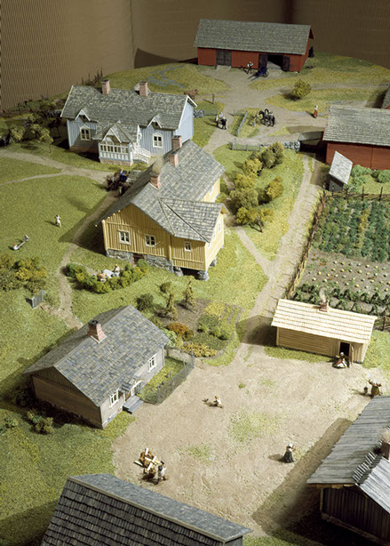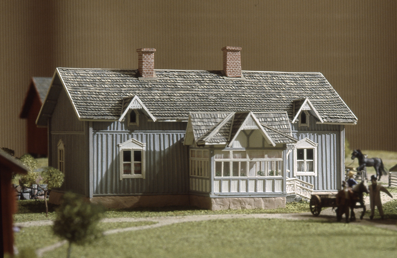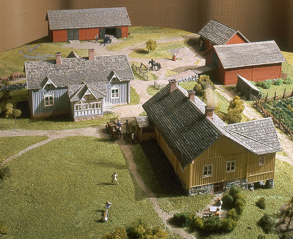 Elämää Glimsin kievarin pihapiirissä 1800-luvulla, vieraita saapuu kieseillään, herrasväki kahvittelee sireenimajassa ja toisaalla palvelusväki toimittaa omia arkisia askareitaan.