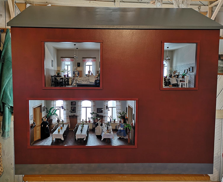 Viitteellisessä pienoismallirakennuksessa on avattu kolme huoneinteriööriä jotka kuvaavat 1800-1900 luvun vaihteen elämää Helsingin Diakonissalaitoksella : potilashuone, ruokasali ja vanhemman diakonissan asuinhuone.
