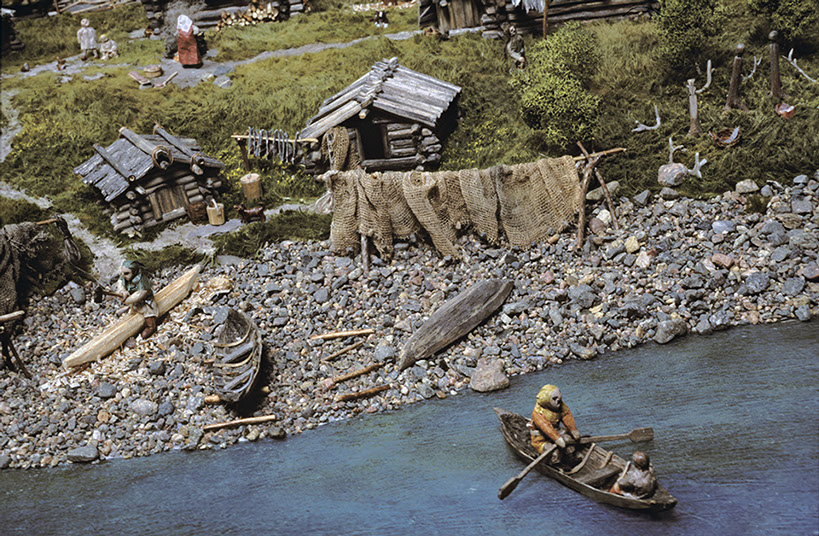 Koirat ja kissat saavat kulkea vapaasti, mutta hevonen ja muutamat ajoporot on pidettävä ohrahalmeista erillään, omilla laitumillaan. Pienet viljelyalat on aidattu arvokkaan sadon suojaamiseksi. Avoin pihatanner ja rantatörmä kuhisee toimintaa, joka suuntautuu vuolaana virtaavaan jokeen. Siinä on veneranta ja limilaitaiset haapiot, keveät kulkuveneet. Niiden partailla ovat loiskineet Perämeren ja Vienanmeren aallot.